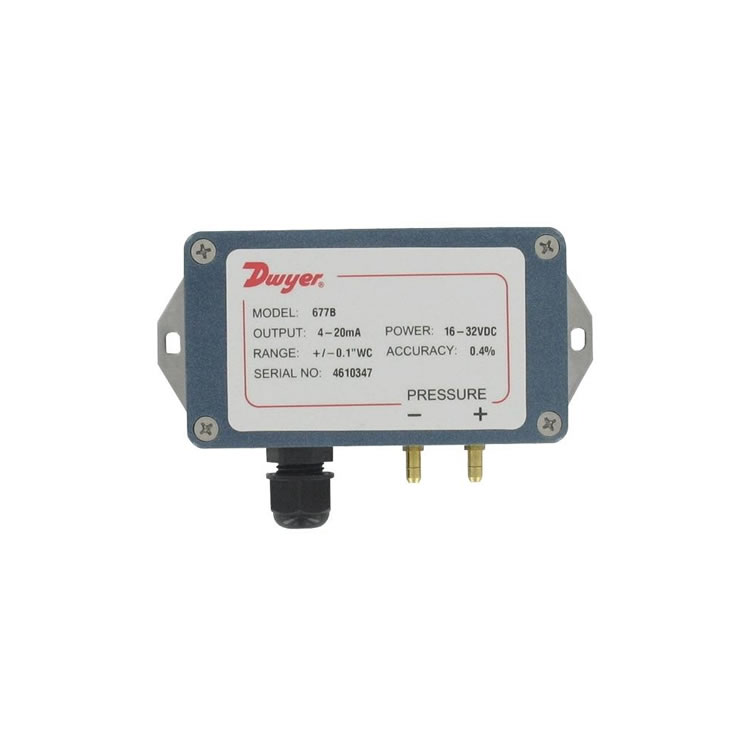 美國Dwyer 677B-05微差壓變送器,量程0-2.5 inH?O(±622 Pa),精度±0.25%FS,4-20 mA二線制輸出,10-32 VDC供電。3/16英寸倒刺軟管接口,體積緊湊,鋁殼IP65,工作溫度-7~70 ℃,重約1磅。適用于潔凈室、過濾器、醫(yī)療隔離室等微差壓監(jiān)測。